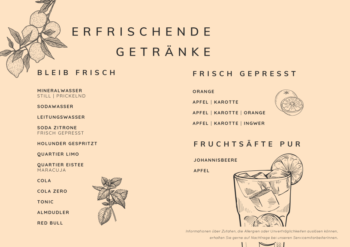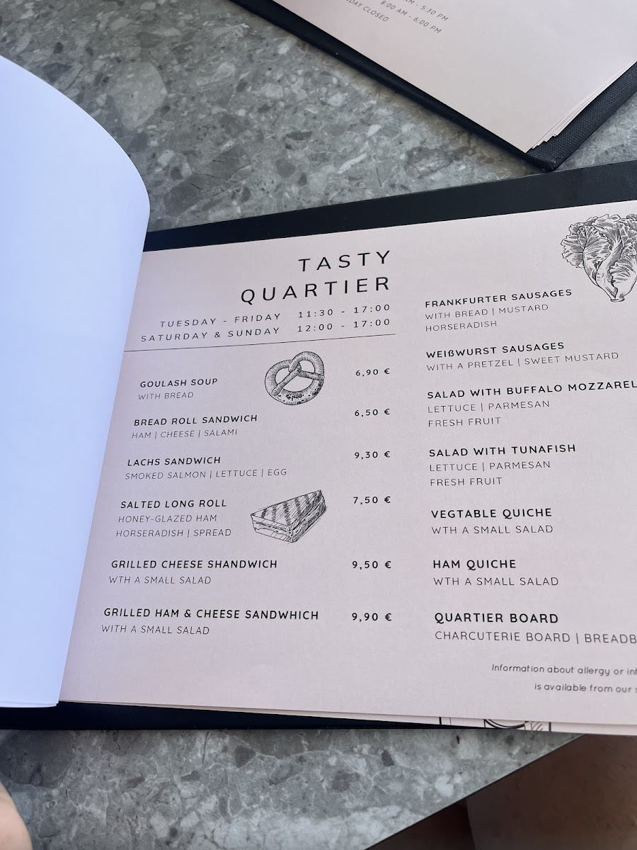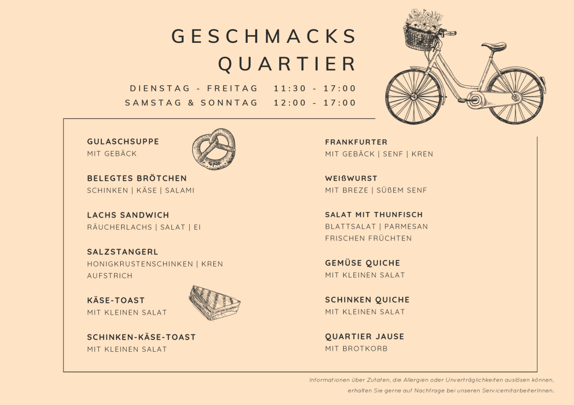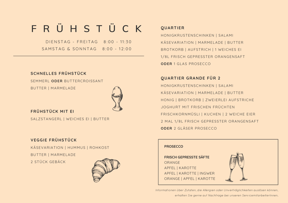 Welcome to Quartier Café, located in the charming heart of Salzburg at Moosstraße 1D. This delightful café seamlessly blends cozy ambiance with a menu that showcases a delectable array of breakfast and snack options. Start your day with the extravagant Quartier Grande breakfast, a feast for two featuring honey-crusted ham, various cheeses, fresh fruits, and a selection of breads, all paired with either freshly squeezed orange juice or Prosecco. The lunch offerings are equally enticing, boasting treats like the rich Gulaschsuppe and the fresh Thunfischsalat.